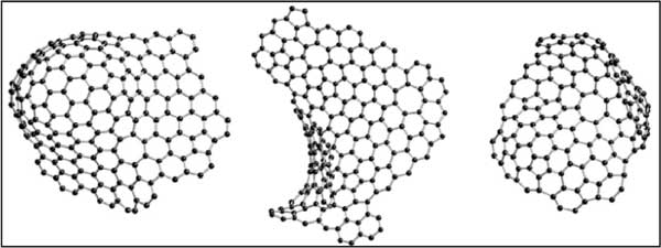 圖1:彎曲片段的示意圖,包含五邊形和七邊形環(huán)以及六邊形。