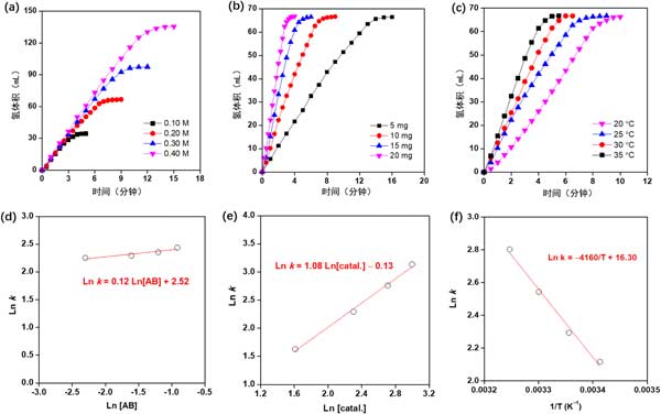 圖2:在不同的(a)氨硼烷濃度、(b)催化劑量和(c)反應(yīng)溫度下,Co0.8Cu0.2P/活性炭催化氨硼烷水解產(chǎn)生的氫氣體積與反應(yīng)時間的關(guān)系圖。(d和e)氫氣產(chǎn)生率(k)分別與氨硼烷濃度和催化劑濃度的對數(shù)圖。(f)lnk與1/T的Arrhenius圖 。
