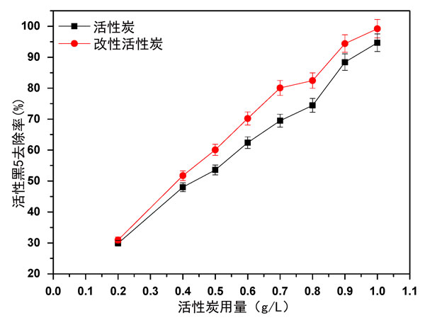 圖2:與活性炭相比,改性活性炭用量對(duì)活性黑5吸附的影響。
