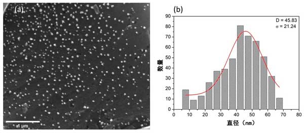 圖2:具有1微米比例尺的SEM圖像顯示納米粒子在活性炭上的均勻分布(a)以及通過對(duì)活性炭混合納米雜化材料的SEM直方圖進(jìn)行高斯擬合獲得的尺寸分布(b)。