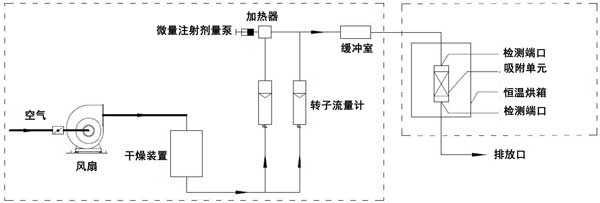 動(dòng)態(tài)吸附實(shí)驗(yàn)在室溫(25℃)下進(jìn)行。實(shí)驗(yàn)裝置由氣體分配系統(tǒng)和吸附系統(tǒng)兩部分組成。吸附系統(tǒng)由恒溫箱和吸附單元組成。檢測(cè)口位于吸附系統(tǒng)之前和之后。動(dòng)態(tài)法測(cè)定活性炭對(duì)脈沖負(fù)荷緩沖性能的裝置如圖1所示。本實(shí)驗(yàn)以乙醇或二甲苯為單一檢測(cè)對(duì)象。氣體分配系統(tǒng)包括風(fēng)扇、干燥裝置、轉(zhuǎn)子流量計(jì)、微注射計(jì)量泵、加熱器和緩沖室。使用FT-IR傅里葉氣體分析儀作為測(cè)量設(shè)備。在氣體分配系統(tǒng)中,在短時(shí)間內(nèi)(2分鐘和5分鐘),微注射計(jì)量泵的注射量迅速增加到原始體積的預(yù)定倍數(shù)(10倍和20倍),以產(chǎn)生脈沖負(fù)載。在吸附系統(tǒng)中,吸附單元內(nèi)放置活性炭。吸附單元的直徑為31mm;钚蕴康奶畛涓叨确謩e為2cm、4cm、6cm、8cm。將吸附裝置置于恒溫箱內(nèi)。吸附劑和吸附物的入口空氣保持在室溫。進(jìn)行了吸附劑在室溫下吸附吸附質(zhì)的脈沖加載實(shí)驗(yàn)。潔凈空氣通過干燥裝置后,利用轉(zhuǎn)子流量計(jì)將其按特定比例分成兩個(gè)通道。通過微注射泵將特定濃度的乙醇或二甲苯氣體注射到氣體中。另一種氣體用作稀釋氣體。兩種氣體流入緩沖室,完全混合后進(jìn)入恒溫箱。穩(wěn)定的氣體按照實(shí)驗(yàn)設(shè)定的濃度、流量和溫度進(jìn)入吸附單元。在通過吸附單元之前和之后測(cè)量乙醇或二甲苯的濃度。