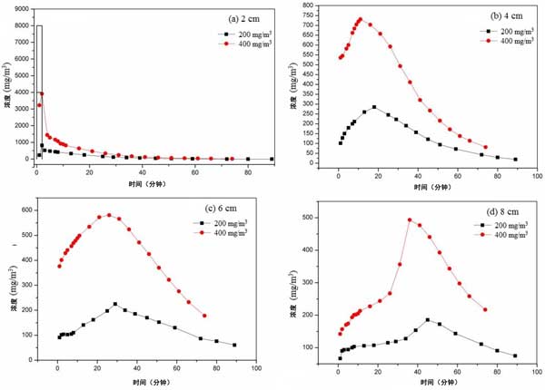 選擇平衡吸附濃度為200和400mg/m3的活性炭。截面風(fēng)速設(shè)定為0.3m/s。乙醇的脈沖濃度是原始平衡濃度的20倍。脈沖時(shí)間為2分鐘。不同活性炭床層高度、不同平衡吸附濃度下脈沖后出口濃度變化曲線如圖3所示。