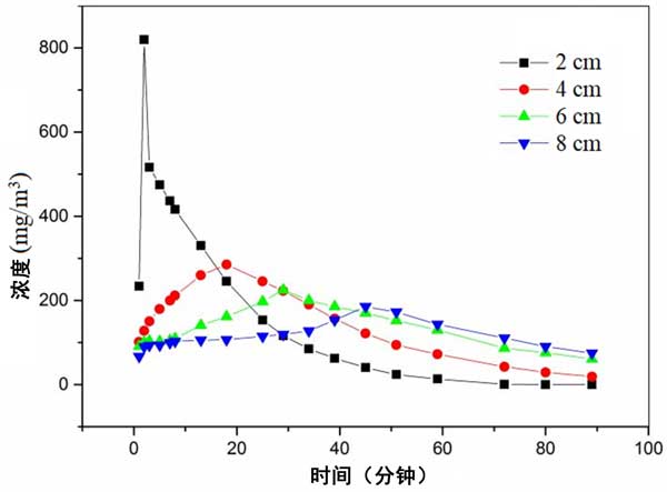 乙醇作為吸附物。截面風(fēng)速設(shè)定為0.3m/s。飽和吸附濃度為200mg/m3。脈沖時(shí)間為2分鐘。脈沖倍數(shù)為20倍。通氣方式為正壓通氣。不同高度出口濃度隨時(shí)間變化曲線如圖4所示。