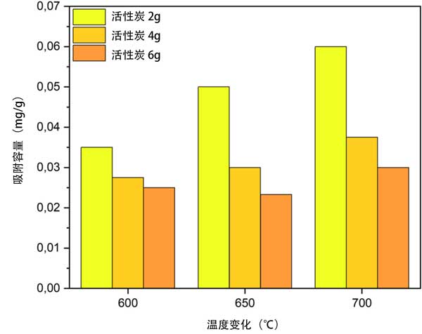 從測試結(jié)果可以看出,在700℃溫度下,吸附劑質(zhì)量為6g,濃度為0.2mg/L,降低百分比為90%。氨(NH3)濃度的降低與質(zhì)量變化的增加和活化溫度的升高成正比。吸附劑質(zhì)量越大且溫度越高,氨(NH3)濃度降低得越多。在圖2中,顯示了活性炭的吸附容量值。因此,可以得出結(jié)論,吸附劑質(zhì)量為2g、溫度為700℃時達到最高吸附容量,即0.06 mg/g。然而,盡管700℃下6g吸附劑質(zhì)量顯示出氨(NH3)濃度百分比降低,但與700℃下2g吸附劑質(zhì)量相比,其吸附容量仍然較低,為0.03mg/g。這是由于NH3吸附過程是由分子間相互作用驅(qū)動的,例如靜電引力、氫鍵、范德華相互作用等。此外,結(jié)果表明,源自肉豆蔻殼的活性炭可以有效降低氨(NH3)水平。那么活性炭具有良好的穩(wěn)定性,并通過吸附容量值證明。