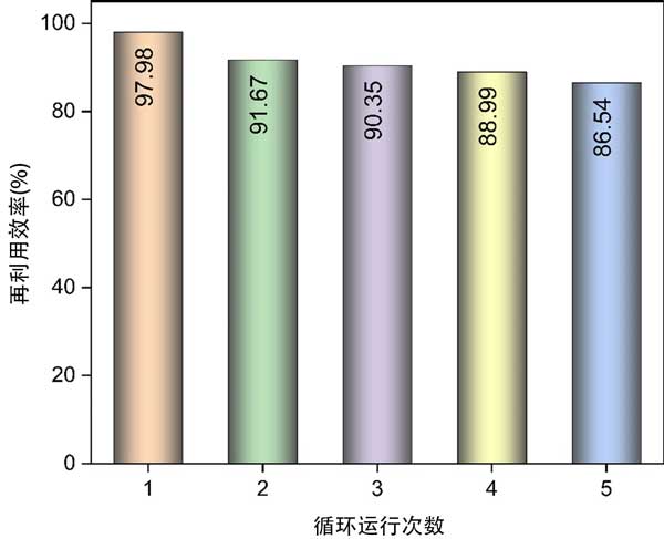 吸附劑的可重復(fù)使用性和吸附穩(wěn)定性在評(píng)估所開(kāi)發(fā)方法的實(shí)際適用性方面起著至關(guān)重要的作用。事實(shí)上,吸附劑的可重復(fù)使用性能是實(shí)際應(yīng)用的首要標(biāo)準(zhǔn),并影響吸附過(guò)程的總體成本;钚蕴勘秸羝降脑倮眯适窃谖鍌(gè)連續(xù)的回收循環(huán)后確定的。如圖4所示,經(jīng)過(guò)五次連續(xù)回收過(guò)程后,活性炭苯蒸氣的再利用效率為86.54%。強(qiáng)大的可重復(fù)使用性和吸附穩(wěn)定性表明活性炭吸附劑和苯吸附物之間存在范德華力或π-π相互作用。相反,不完全的再生過(guò)程可歸因于吸附表面上永久鍵的形成,導(dǎo)致吸附基團(tuán)的不可逆轉(zhuǎn)化。換句話說(shuō),一些在再生過(guò)程中未解吸的化學(xué)結(jié)合吸附物可能會(huì)堵塞孔隙,導(dǎo)致殘留物形成。