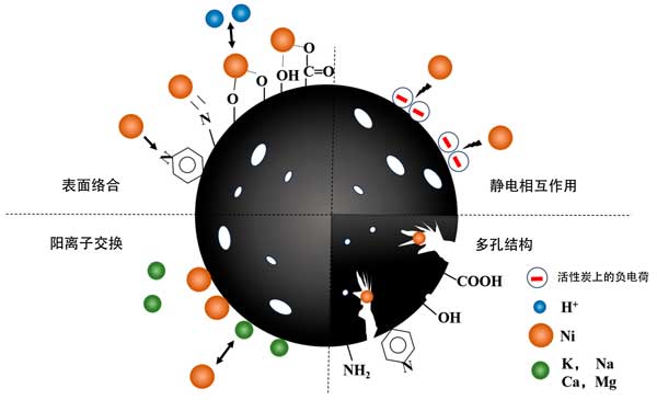 活性炭改性后高效去除廢水中的鎳,用了一種新的改性方法來制備活性炭。改性劑為硫酸四氨合銅(II)一水合物([Cu(NH3)4]SO4·H2O);钚蕴客ㄟ^吸附有效去除水中的Ni(II)。與未改性的活性炭相比,活性炭的改性導(dǎo)致比表面積和總孔體積降低,而改性導(dǎo)致比表面積和總孔體積增加氧和氮的存在,表明含O和含N官能團的結(jié)合。改性活性炭相對于活性炭表現(xiàn)出優(yōu)異的吸附能力。值得注意的是,改性活性炭表現(xiàn)出強大的緩沖能力和對pH變化的適應(yīng)性。Ni(II)在活性炭上的吸附機制包括表面絡(luò)合、陽離子交換和靜電相互作用。本研究概述了一種經(jīng)濟有效的方法來制備用于吸附廢水中Ni(II)的活性炭,并闡明了潛在的吸附機制。