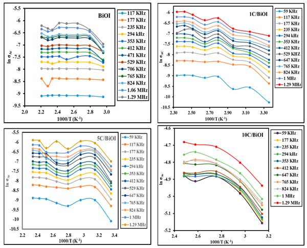 圖4:溫度對BiOI、1C/BiOI、5C/BiOI和10C/BiOI納米復(fù)合材料在不同頻率下交流電導率的影響。