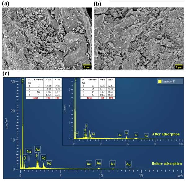 圖1:活性炭(a)吸附前和(b)吸附后的FESEM,(c)吸附前后活性炭的EDS光譜。