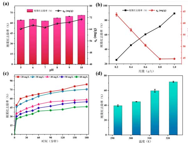 圖2:吸附參數(shù)包括(a)pH值的影響,(b)劑量的作用,初始剛果紅濃度的影響,以及(d)溫度對(duì)剛果紅在活性炭上吸附的影響。