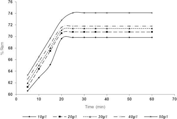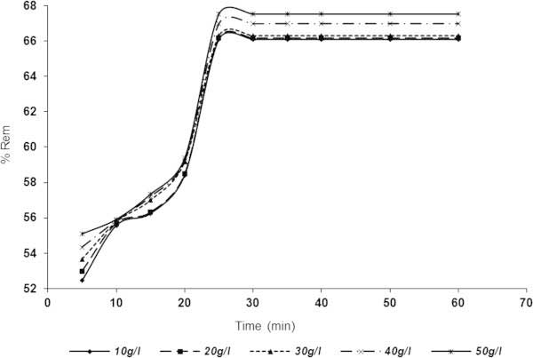 用于吸附除去SDP的相對于時間和吸附劑劑量的結(jié)果示于圖2,3在10-50克/升的范圍內(nèi)。圖 5和6表明,SDP去除與在吸附劑用量增加而增加。從圖中可以看出,對于活性炭1(圖2)和活性炭2(圖 3),平衡時間為30分鐘后,顆粒截留迅速增加并趨于恒定 。從圖 5中,活性炭1在10g / l時的去除百分數(shù)分別為5和30-60分鐘時的60.5978和69.8369%。對于活性炭1(圖 2),分別以50g / l,63.3152和74.1168%記錄5分鐘和(30-60)分鐘。在圖3(活性炭2)中描繪了類似的趨勢, 其中在10g / l劑量下分別在5分鐘和(30-60分鐘)達到52.4456和66.1005%。對于50g / l 活性炭2劑量,分別在2和(30-60)分鐘時達到55.095和67.527%的去除率。結(jié)果表明,活性炭1在本實驗條件下表現(xiàn)優(yōu)于活性炭2。