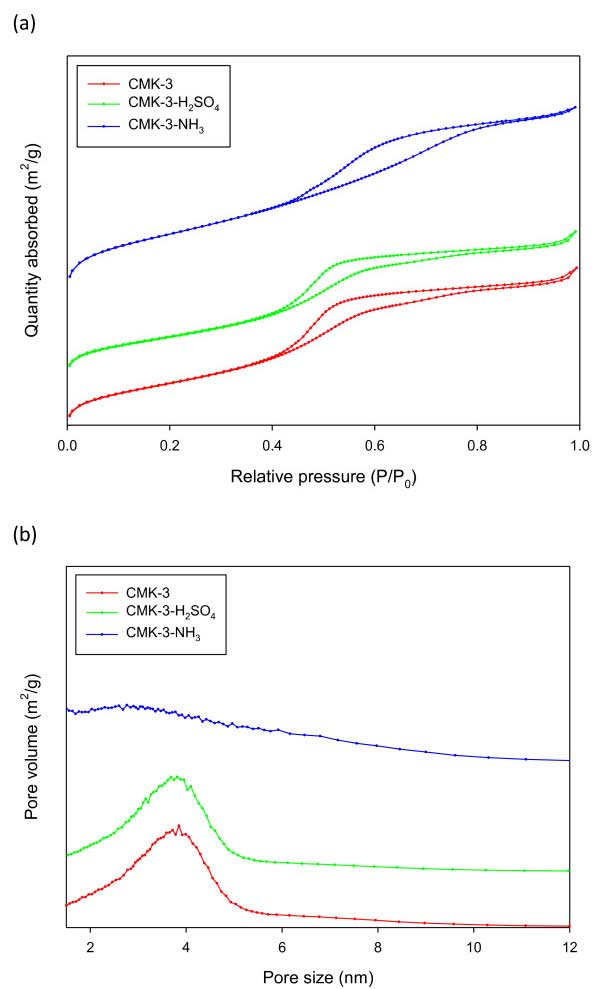 表1列出了本研究中使用的活性炭的物理性質;钚蕴-3的比表面積為1178m 2 / g。經硫酸處理后比表面積略有下降至1,002m 2 / g,經氨處理后比表面積大幅度上升至1663m 2 / g。圖2示出了氮氣吸附等溫線和孔碳的孔隙大小分布。圖2a示出了用于活性炭-3,活性炭-3-H的氮吸附等溫線2 SO 4,和活性炭-3-NH 3。所有樣品在0.5 的相對壓力(P / P 0)下都顯示典型的介孔材料的IV型等溫線。表表11表明,CMK-3具有的3.8納米的孔徑中孔。用硫酸處理后維持這些中孔。當活性炭-3用氨處理時,平均孔徑減小到3.1nm。氨處理是高溫(900℃)工藝,其產生微孔,引起表面積的大量增加和平均孔徑的減小。另一方面,大部分介孔活性炭-3在氨處理后保持。