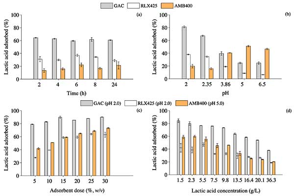 目前的研究表明,活性炭是一種好的吸附劑。然而,吸附在吸附劑上的乳酸的量不能作為選擇合適吸附劑的唯一參數(shù)。另外,活性炭的吸附能力經(jīng)過(guò)不同的吸附和解吸循環(huán)后可以降低,因此活性炭的長(zhǎng)期性能對(duì)選擇最經(jīng)濟(jì)可行的材料至關(guān)重要。從吸附劑中解吸乳酸是一個(gè)重要的因素,需要作為下游加工策略來(lái)考察,但超出了本研究的范圍。