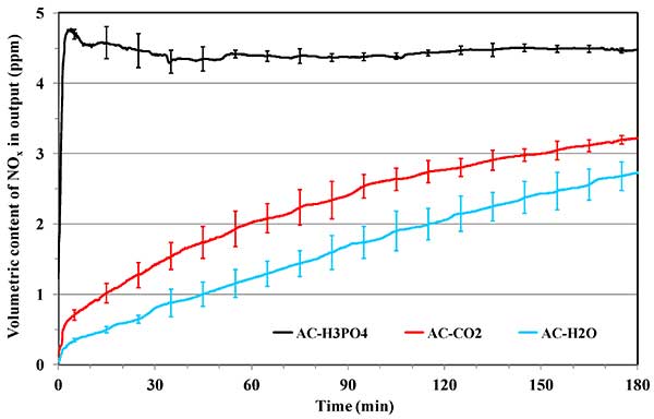 盡管用于汽車和工業(yè)廢氣都實施了減排措施,城市人口與車輛的增加導致了更多氮氧化物的排放。使用木質(zhì)纖維為前體制造的活性炭在環(huán)境溫度去除氮氧化物。這些活性炭吸附劑表現(xiàn)出令人感興趣的吸附容量范圍在40mg/g和120mg/g之間。然而,這些活性炭的性能通常在干燥和潮濕條件下在空氣存在下在500-1000ppmNO濃度下進行評估。