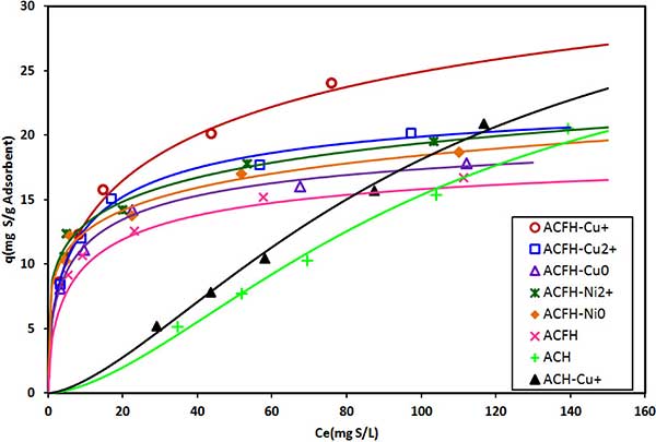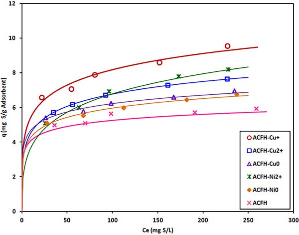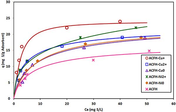 圖1. DBT在浸漬有不同銅和鎳物質(zhì)的活性炭上的吸附等溫線。