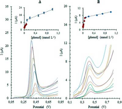 圖2、使用DPV方法在的氧化鎳活性炭自來(lái)水中(A)和橄欖油(B)樣品的苯酚校準(zhǔn)曲線(xiàn)改性的碳電極在1.0的濃度范圍 × 10 -6 mol L−1至1.0 × 10 -3 mol L−1。