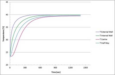 圖2、 當設備從環(huán)境條件轉(zhuǎn)移到40℃的水中時,床中和設備外表面上的溫度分布。