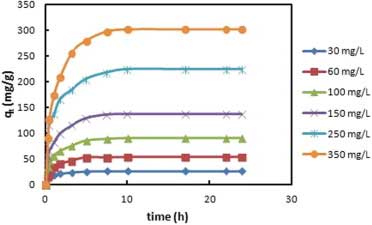 2.在不同初始濃度下,接觸時間對氯乙醇在活性炭上吸附的影響。