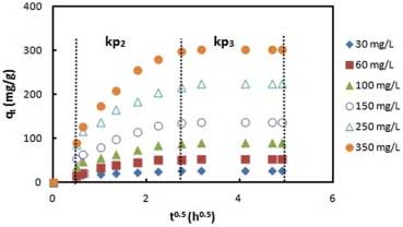 | k p2(mg / g h 1/2) | k p3(mg / g h 1/2) | C 2 | C 3 | (R 2)2 | (R 3)2 | |