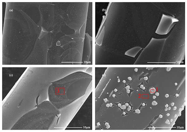 圖1中的FESEM圖像顯示了氧化鈦改性活性炭含銀纖維的表面形態(tài)。在活性炭含銀纖維的表面上觀察到許多納米顆粒,活性炭表面的這些銀納米顆粒被二氧化鈦薄膜包覆,隨著濃度的增加,它們的直徑從約0.2μm急劇增加到1μm。當濃度達到0.4mol/L時,銀納米顆粒不能被二氧化鈦薄膜完全覆蓋。而且,活性炭纖維上的二氧化鈦膜的厚度不均勻。