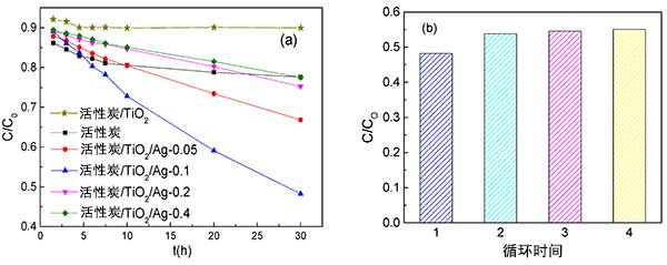 圖2:(a)這幾種活性炭的亞甲基藍去除效果,(b)經(jīng)歷循環(huán)試驗的活性炭含銀纖維的亞甲基藍去除效果。