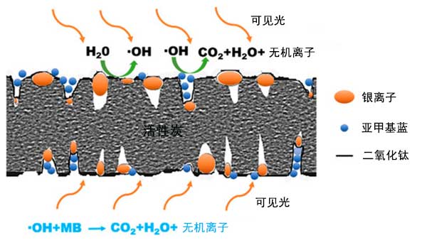通過光催化降解再生活性炭具有很大的優(yōu)勢,因為與其他再生工藝如熱和化學(xué)處理,微生物再生,電化學(xué)方法和超臨界萃取相比,它具有成本低,二次污染少的特點。此外,光催化再生可以通過同時進行光催化降解和吸附來實現(xiàn)活性炭的自再生。二氧化鈦(TiO 2)是一種高效的光催化劑,通常固定在活性炭上進行再生。然而,TiO 2的光催化降解部分受到限制,因為它具有兩個固有特性:(1)具有大的帶隙,TiO 2僅吸收UV光子,其僅占太陽光譜中能量的約5% ,(2)由于電荷載體的快速復(fù)合,TiO 2具有低的光催化活性。為了延長光響應(yīng)區(qū)域,貴金屬被摻入TiO 2中,包括金,銀和鉑。與金和鉑相比銀具有抗菌活性和低成本,因此具有更廣泛的應(yīng)用領(lǐng)域。