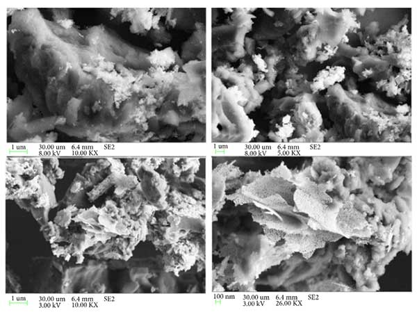 掃描電子顯微鏡分析:SEM研究證實(shí)了氧化鋅在活性炭載體上的負(fù)載,圖1示出了活性炭的SEM圖像?梢钥闯觯钚蕴砍始(xì)孔的不規(guī)則圖案。另外,氧化鋅顆粒沉積在活性炭的表面和孔中。仔細(xì)觀察表明活性炭表面上的片狀氧化鋅結(jié)構(gòu)。