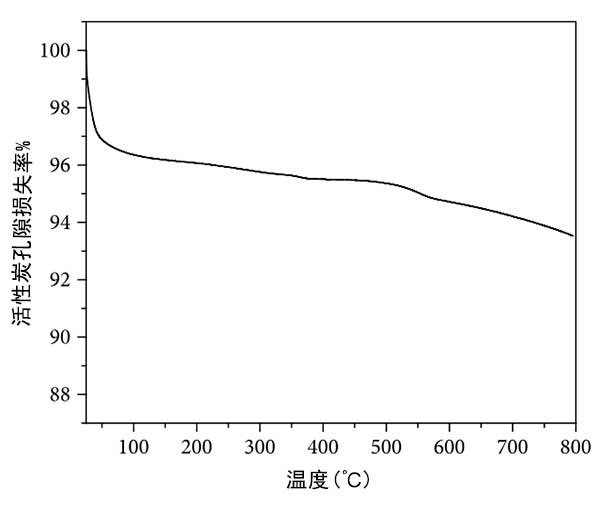 熱重分析:通過(guò)使用TGA分析研究了合成催化劑活性炭的熱穩(wěn)定性。發(fā)現(xiàn)催化劑是穩(wěn)定的,并且在450℃的溫度下記錄了約2%的重量損失(圖3),并且可以清楚地看出浸漬降低了碳含量并因此導(dǎo)致孔隙的減少。
