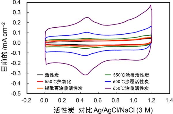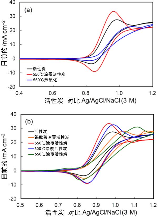 在沒有釩離子的酸性電解質(zhì)中獲得的循環(huán)伏安圖顯示在圖3中。伏安圖中的電流由三個(gè)組分組成,即活性炭-電解質(zhì)界面處的電化學(xué)雙層充電電流,以及由于表面官能團(tuán)的氧化還原反應(yīng)和活性炭表面氧化引起的法拉第電流。電化學(xué)雙層充電產(chǎn)生恒定電流和矩形CV形狀。電流取決于基面和邊緣平面的曝光程度,在0.5V附近的寬氧化還原峰和0.8V以上的氧化電流分別歸因于醌/氫醌樣表面官能團(tuán)的氧化還原反應(yīng)和活性炭表面氧化。這些電流在熱氧化后增加,并且在錫酞菁涂覆活性炭的熱氧化期間隨著溫度的升高而增加。電化學(xué)雙層電流的增加歸因于邊緣平面的暴露,這與拉曼光譜一致。對于錫酞菁涂覆活性炭觀察到的活性炭表面氧化電流意味著高表面粗糙度的發(fā)展。