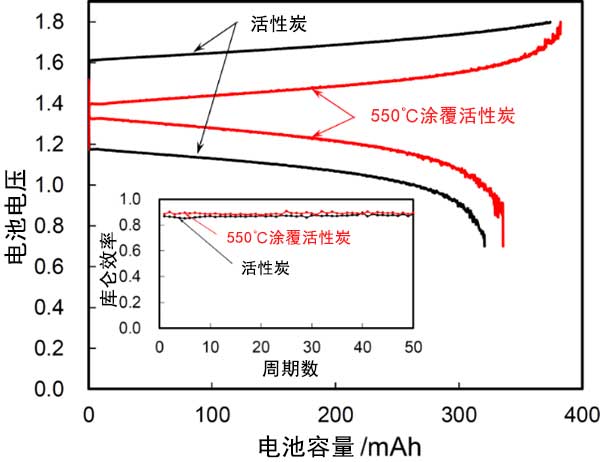 圖4:使用活性炭和錫酞菁涂覆活性炭作為電極的流通池的充放電曲線和循環(huán)性能。