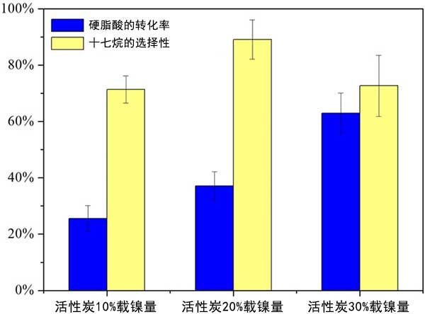 結(jié)果發(fā)現(xiàn)制備的活性炭載鎳催化劑并表現(xiàn)出優(yōu)異的脫羧活性和維持。硬脂酸可在370℃下完全轉(zhuǎn)化5小時(shí),對(duì)十七烷的選擇性約為80%。過(guò)量的鎳顆?赡軙(huì)阻塞一定量的活性炭孔隙并減少孔隙體積。隨著高鎳負(fù)載量或催化劑負(fù)載量,裂解產(chǎn)物增加。溫度顯著影響硬脂酸的轉(zhuǎn)化,但不影響選擇性。具有大碳數(shù)的脂肪酸在活性炭反應(yīng)體系中易于裂化。