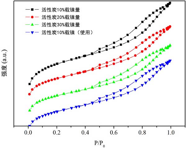 為了研究活性炭載鎳催化劑的可重復(fù)使用性,首先在真空下過(guò)濾分離先前實(shí)驗(yàn)的廢活性炭,然后用丙酮徹底洗滌,接著用水洗滌多次。然后將過(guò)濾的活性炭在強(qiáng)制通風(fēng)烘箱中在110℃下干燥,然后在管式爐中在氮?dú)饬飨略?00℃下煅燒4小時(shí)。經(jīng)過(guò)從新活化的活性炭的測(cè)試,活性炭對(duì)硬脂酸的產(chǎn)率和選擇性轉(zhuǎn)化為十七烷在重復(fù)三次催化后性能幾乎沒(méi)有下降。選擇性保持在約90%,在無(wú)溶劑體系中保持穩(wěn)定。活性炭的N2吸附-脫附等溫線(xiàn)如圖3所示,表明隨著鎳負(fù)載量的增加,活性炭的表面積和孔體積減小,表明過(guò)量的鎳顆?赡茏枞欢康幕钚蕴靠撞p少孔體積。