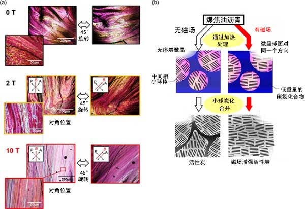圖2:(a)在沒有和存在2T和10T的磁場的情況下制備的活性炭前體材料的偏振顯微鏡圖像。(b)對煤焦油瀝青的碳化過程的磁場效應(yīng)的示意圖。