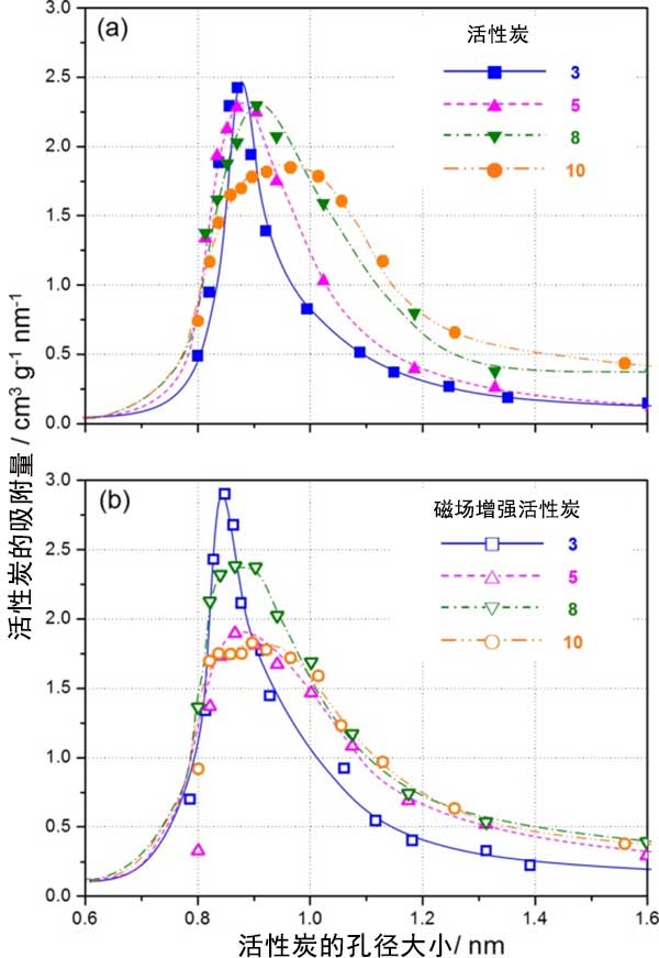 從煤焦油和瀝青制備活性炭的微孔分布,從所獲得的吸附等溫線,在圖3兩種活性炭的孔徑差異非常小相差不到0.04nm,并且在兩種情況下大多數(shù)孔分布在0.80和0.95nm之間。然而,觀察到由磁場增強過的活性炭吸附量在該區(qū)域中大大增加。從吸附等溫線可以估計0.8至0.95nm范圍內(nèi)的總吸附量約為1.25倍。當(dāng)活化劑量加大時兩種活性炭的孔徑分布均發(fā)生變化,產(chǎn)生了略大的孔隙結(jié)構(gòu)。