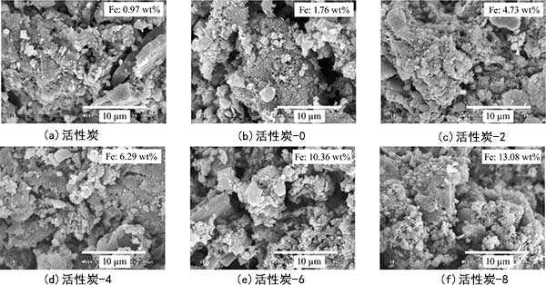 載鐵活性炭的SEM照片如圖1所示。載鐵活性炭具有片狀石墨填充結(jié)構(gòu)的表面形態(tài),其顯示產(chǎn)生大量微孔。對于所有活性炭,觀察到小的聚集體,其看起來更亮并且在活性炭的較暗表面上得到支撐。細(xì)氧化鐵顆粒傾向于覆蓋活性炭的表面而不是均勻地分散在整個(gè)表面上。作為四氧化三鐵的添加量增加,活性炭表面的聚集增加。通過能量分散X射線(EDX)分析(未顯示),證實(shí)聚集體是含鐵化合物。樣品的鐵含量顯示在圖1中每張圖的右上角。