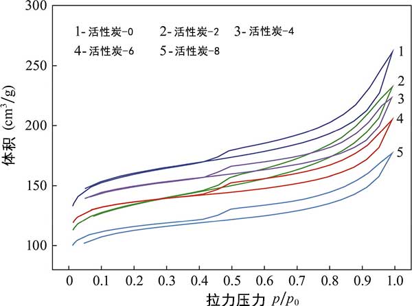 氮等溫線:圖2顯示了活性炭的氮吸附-解吸等溫線?梢钥闯,根據(jù)IUPAC分類,所有活性炭的等溫線屬于具有磁滯回線的Ⅳ型等溫線,表明活性炭具有中孔。隨著四氧化三鐵添加量的增加,活性炭的等溫線低于載鐵活性炭的等溫線,表明比表面積減小,孔隙增大。