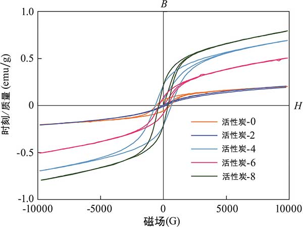 活性炭的磁滯回線如圖3所示。隨著鐵含量增加,活性炭的飽和磁化強(qiáng)度首先降低并隨后增加。活性炭的飽和磁化強(qiáng)度值與活性炭中殘留的四氧化三鐵和金屬鐵的量有關(guān),因?yàn)樗鼈兙哂写判?yīng);钚蕴康奶囟ù呕适谴欧蛛x的重要參數(shù)之一。