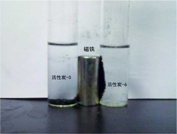 與不含鐵的活性炭相比,在四氧化三鐵存在下制備的磁性活性炭的矯頑力和剩磁有顯著影響。矯頑力和剩磁的低值接近于零表明活性炭在室溫下表現(xiàn)出超順磁性。活性炭的超順磁行為使其更容易被磁鐵或磁場分開。同時(shí),低剩磁在活性炭與原始解決方案分離后,大大減少了活性炭的聚集。使用磁鐵的簡單分離試驗(yàn)的結(jié)果如圖4所示。