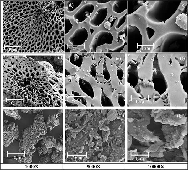 FESEM:三種活性炭在不同放大倍數(shù)下的顯微圖像顯示在圖3中?展钚蕴繕悠樊a(chǎn)生的蜂窩狀圖案孔隙網(wǎng)絡(luò)與優(yōu)化的碳納米管相似。油棕纖維活性炭上的孔也類似于空果束活性炭的蜂窩圖案。然而,與油棕纖維炭和棕櫚仁殼炭相比,空果束炭中的孔網(wǎng)絡(luò)更加突出和發(fā)展。棕櫚仁殼活性炭樣品顯示出很少的隧道孔,并含有阻塞毛孔的可見微塊。發(fā)達(dá)的多孔網(wǎng)絡(luò)表明可以沉積吸附物或離子的高表面積。