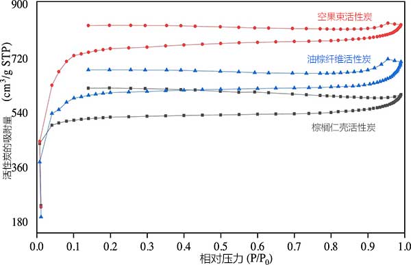 BET表面積和孔徑分布:所述吸附物在物理吸附過程中使用是氮?dú)。吸附和解吸等溫線用于估計(jì)每個(gè)活性炭的表面積和孔分布。圖5顯示了三種活性炭的等溫線圖。在低相對(duì)壓力下在所有樣品上觀察到開放式II型滯后曲線。據(jù)說,當(dāng)前體碳化過程中不完全燃燒導(dǎo)致孔隙收縮時(shí),這種開口性和低相對(duì)壓力下的低吸附性隨著相對(duì)壓力的增加而增加]。