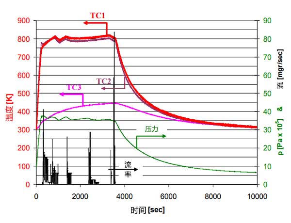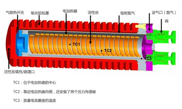 排出壓力約為3.5MPa的實驗結(jié)果如圖4所示。250秒后,加熱功率為500W,中心溫度超過476℃,而電池底座溫度則為76℃。然而,將電池達到其穩(wěn)態(tài)溫度分布需要大約60分鐘,其中電池基座中的溫度為166℃;钚蕴康臏囟炔辉试S超過526℃。 60分鐘,加熱功率逐漸降低,以保持最高溫度低于526℃,壓力高于3.5MPa。由于電池基座的溫升速率隨時間降低,輸送的氮量也減少了。因此,在15分鐘后結(jié)束放電階段僅從活性炭吸附池釋放4.6g氮。圖4中的冷卻階段持續(xù)約100分鐘,并且如果放電階段在15分鐘后結(jié)束(此時基礎(chǔ)溫度僅為126℃),則可以減少冷卻階段;钚蕴恐械募訜岷屠鋮s速率以及溫度分布與數(shù)值分析估計的相似。這表明簡化的數(shù)值傳熱分析為吸附池中的傳熱提供了令人滿意的估計。