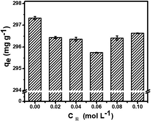 染料廢水含有各種鹽類和金屬離子,影響活性炭的吸附效率。在圖2中可以觀察到孔雀石綠對活性炭的吸附能力受鹽濃度的顯著影響。當NaCl濃度為0.02mol L-1時,吸附容量意外降低。然而,在將鹽濃度增加到0.10mol L-1的同時,這種負面影響將變得可以忽略不計。如上所述,靜電相互作用可能在吸附過程中起關鍵作用。