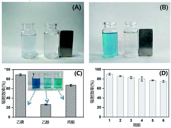 活性炭的回收和再利用是在實際應用中需要考慮的關鍵因素。因此,我們調查了活性炭的恢復和可重用性。通過外部磁體很容易將活性炭與水溶液分離(圖3A和B)。通過使用乙腈,乙醇和丙酮作為洗脫液輔助超聲來再生裝載孔雀石綠的活性炭。乙腈的解吸效率優(yōu)于乙醇和丙酮,解吸效率分別為90.2%,35.7%和71.3%(見圖3C);钚蕴吭诮馕驮偕笫欠(wěn)定的。此外,六個循環(huán)后沒有明顯的吸附效率損失(圖3D)。對活性炭的快速吸附,大吸附容量和良好的可重復使用性促使我們研究其實際應用。將活性炭分散在含有加標孔雀石綠(25mg L-1)的廢水中。在用外部磁體快速吸附和分離活性炭后獲得澄清的上清液(圖3A和B)。結果表明,活性炭是一種經濟有效的高性能吸附劑,用于孔雀石綠吸附和去除廢水。
