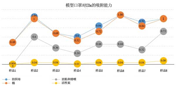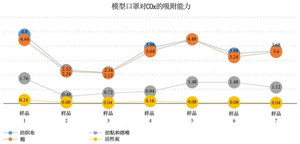 活性炭組合口罩模型組在吸收COx方面比其他口罩模型具有更高的能力。不使用口罩/控制3.40 ppm(吸入氣體)檢測(cè)COx廢氣排放的平均結(jié)果高于使用其他口罩,即棉布材料3.39 n/mm3,紡粘和熔噴1.13 ppm以及0.10ppm的活性炭組合材料,紡粘和熔噴的口罩(參見(jiàn)圖1)。