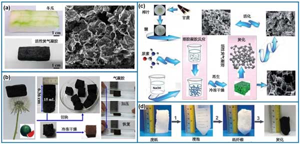 活性炭氣凝膠由納米結(jié)構(gòu)活性炭材料組成,其中孔隙充滿(mǎn)氣體。因?yàn)榭梢越Y(jié)合有益吸附性質(zhì)和高的熱穩(wěn)定性,并且擁有電子傳導(dǎo)性,和可成為催化劑載體,油或有機(jī)溶劑吸附和儲(chǔ)能方面的潛在應(yīng)用。活性炭氣凝膠還有一個(gè)特征是它們的超輕質(zhì)。除了高度多孔和輕質(zhì)之外,另一個(gè)優(yōu)點(diǎn)是在轉(zhuǎn)化成活性炭氣凝膠后引入導(dǎo)電性的可能性,因此允許在電化學(xué)區(qū)域(例如,電池,超級(jí)電容器或?qū)щ姶呋瘎┹d體)中的應(yīng)用。隨著新型活性炭材料的發(fā)展,已經(jīng)生產(chǎn)出具有超低密度和優(yōu)異導(dǎo)電性的石墨烯或基于納米碳管的活性炭氣凝膠作為新興的新型氣凝膠材料,這進(jìn)一步拓展了氣凝膠材料的應(yīng)用領(lǐng)域。除了高級(jí)碳材料能制造氣凝膠外,使用生物質(zhì)做成的活性炭氣凝膠如圖7所示。