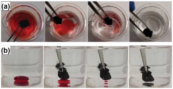 圖4:(a)通過(guò)使用間隔10秒的活性炭氣凝膠顯示庚烷吸附過(guò)程的照片。(b)照片顯示使用活性炭氣凝膠吸附氯仿的過(guò)程5秒內(nèi)完全被吸收。