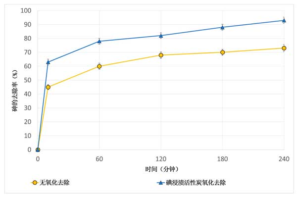 圖4:使用或不使用碘浸漬活性炭時,鐵浸漬活性炭上砷吸附動力學(xué)的比較。