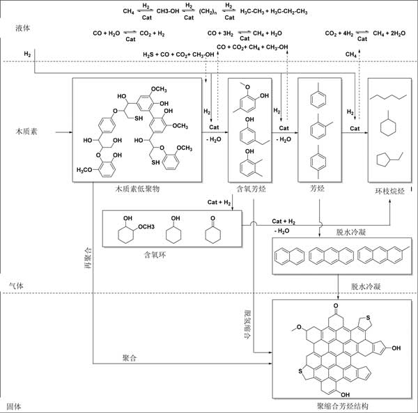 基于木質(zhì)素油的產(chǎn)物產(chǎn)率和組成,提出了一種用于加氫處理的反應(yīng)過程。木質(zhì)素使用活性炭催化劑和氫氣(圖3)。它涉及在液相和氣相中發(fā)生的許多連續(xù)和平行反應(yīng)。對低分子量烷基酚類和芳族化合物的所需反應(yīng)涉及通過裂解鍵來對木質(zhì)素進(jìn)行熱和催化解聚(加氫裂化)。最具反應(yīng)性的連接是醚鍵,盡管這些在木質(zhì)素中不是很豐富;钚蕴看呋瘎┐龠M(jìn)解聚反應(yīng),但在不存在活性炭催化劑的情況下的反應(yīng)也產(chǎn)生(有限)量的木質(zhì)素油,表明熱解聚反應(yīng)也起作用。低聚物片段可以進(jìn)一步解聚成烷基酚類形式的低分子量化合物或再聚合(也與已形成的低分子量化合物一起)成更高濃度的結(jié)構(gòu),最終導(dǎo)致燒焦。后一種途徑可能是熱反應(yīng),因此可以通過使用非;顫姷幕钚蕴看呋瘎﹣硪种疲龃呋瘎┩ㄟ^催化隨后的轉(zhuǎn)化來減少活性中間體的量。中間低分子量烷基酚類在反應(yīng)條件下不是惰性的,并且可以進(jìn)一步加氫脫氧成芳族化合物和烷烴。