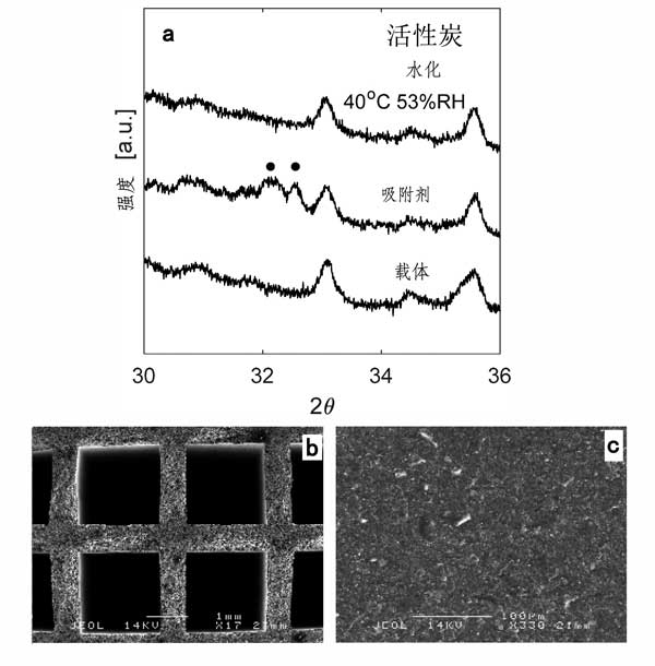 圖1a顯示了在40℃和相對濕度為53%下水合處理后活性炭載體,吸附劑和活性炭X射線衍射圖。由于碳酸鉀倍半水合物的反射特性的存在證實了鹽在載體上的負(fù)載。由于載體中加載的鹽量低,解釋了這些反射的低強度,5.58wt%。其余的峰對應(yīng)于載體中的不同相,例如碳和二氧化硅。圖1b顯示了活性炭載體的SEM照片。如圖中所看到的圖中,信道是正方形幾何形狀的具有每邊1.979±0.006毫米的長度,并且所述通道之間的壁的厚度是0.651±0.022毫米。圖1c示出了通道的內(nèi)壁的表面上,他們看起來很同質(zhì)。