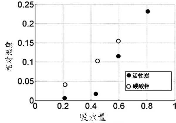 根據(jù)以前的測試結(jié)果,當(dāng)相對濕度在6至10%的范圍內(nèi)并且其在40%以上潮解時,碳酸鉀在25℃開始水合。如圖2所示活性炭載體和吸附劑在40℃下的水吸附容量。活性炭載體的吸收在相對濕度為60%下急劇增加,在相對濕度為80%下達(dá)到最大23%的重量增加。在那里,吸附劑的吸收量幾乎是載體的6倍,并且最重要的是,它遠(yuǎn)遠(yuǎn)高于理論上形成碳酸鉀倍半水合物所需的量。這種顯著差異的原因是鹽在約相對濕度為43%下潮解,因此所有過量的水在載體材料的孔中冷凝,產(chǎn)生鹽的水溶液。