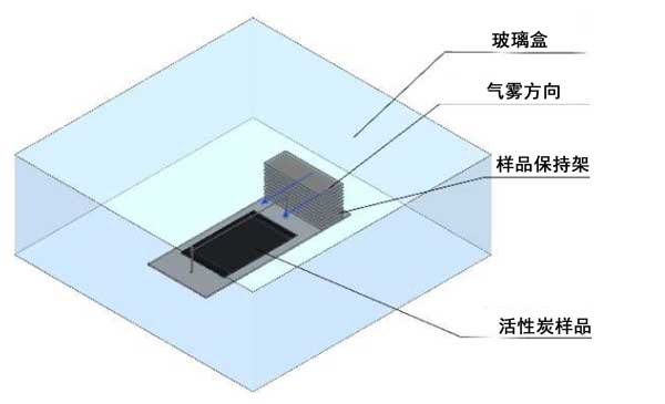 活性炭關(guān)于電場(chǎng)附增強(qiáng)吸附測(cè)試設(shè)備,由一個(gè)樣品架組成,樣品架放置在一個(gè)33厘米×33厘米×12厘米的帶有硼硅酸鹽玻璃壁的盒子內(nèi)(圖3)。風(fēng)扇(位于偏轉(zhuǎn)板后面)引起平行的空氣通量到樣品。在細(xì)的(直徑為180 µm)鎢絲電極(放電電極)上施加正電勢(shì),而相對(duì)電極(活性炭)通過兩端的兩個(gè)接地連接接地。